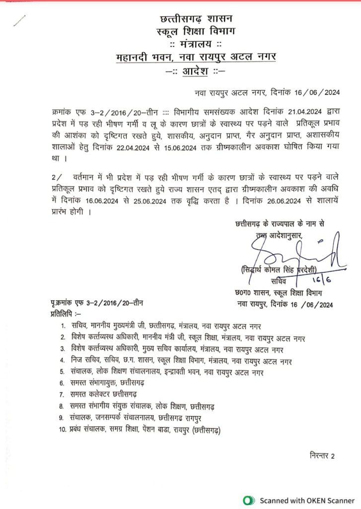 रायपुर- छत्तीसगढ़ सरकार का फैसला अब स्कूल खुलने की तिथि बढ़ी।छत्तीसगढ़ प्रदेश में 18 जून से स्कूल नहीं खुलेंगे। गर्मी को देखते हुए मुख्यमंत्री साय ने तारीख को आगे बढ़ाने के निर्देश दिए हैं। अब इसे एक एक हफ्ते के लिए आगे बढ़ा दिया गया है। इसके बाद स्कूल शिक्षा विभाग ने भी आदेश जारी करते हुए 26 जून से क्लास लगाने की बात कही है। इससे पहले प्रदेश में पड़ रही भीषण गर्मी और लू के कारण 22 अप्रैल से 15 जून तक गर्मी छुट्टी घोषित की गई थी। वहीं 16 जून को रविवार और 17 जून को बकरीद त्योहार होने के कारण स्कूल 18 जून से खुलने थे लेकिन अब इसे भी आगे बढ़ा दिया गया है। नए आदेश के मुताबिक, वर्तमान में भी प्रदेश में पड़ रही भीषण गर्मी के कारण छात्रों के स्वास्थ्य को देखते हुए गर्मी की छुट्टियां एक हफ्ते और बढ़ाई गई हैं। 16 जून से 25 जून तक इसे बढ़ा दिया गया है। अब 26 जून से स्कूल खुलेंगे।