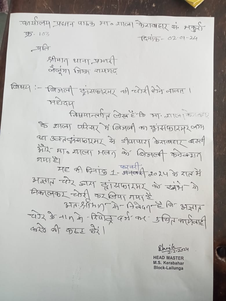 स्कूल भवन के लिए लगा ट्रांसफार्मर हुई चोरी, स्कूल संचालक ने की थाने में शिकायत!